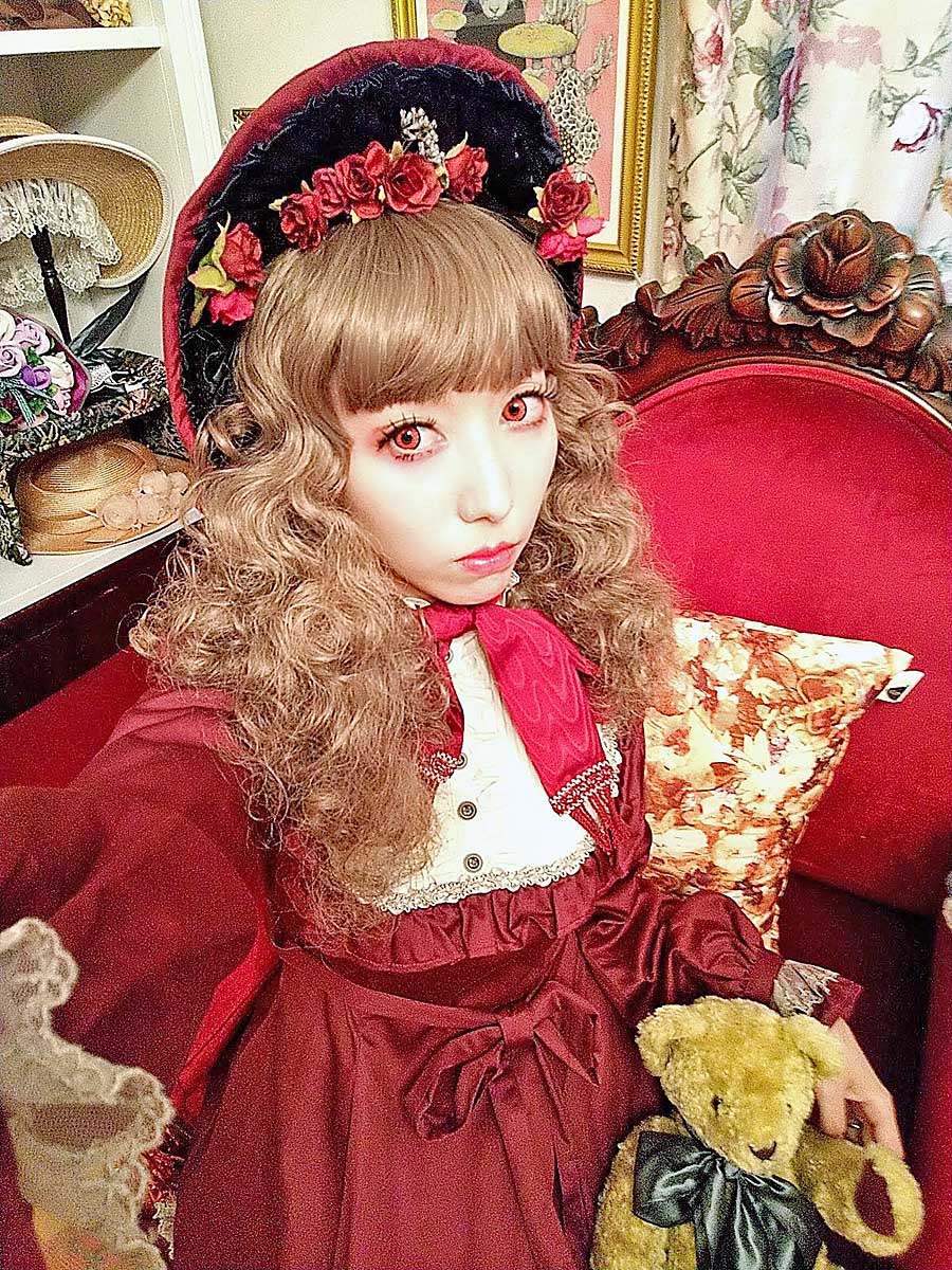 地毛でも多少ヴァンパイアっぽい雰囲気が普段より出せているのは赤いカラコンの着用とワインレッド×ブラックという配色でしょうか。