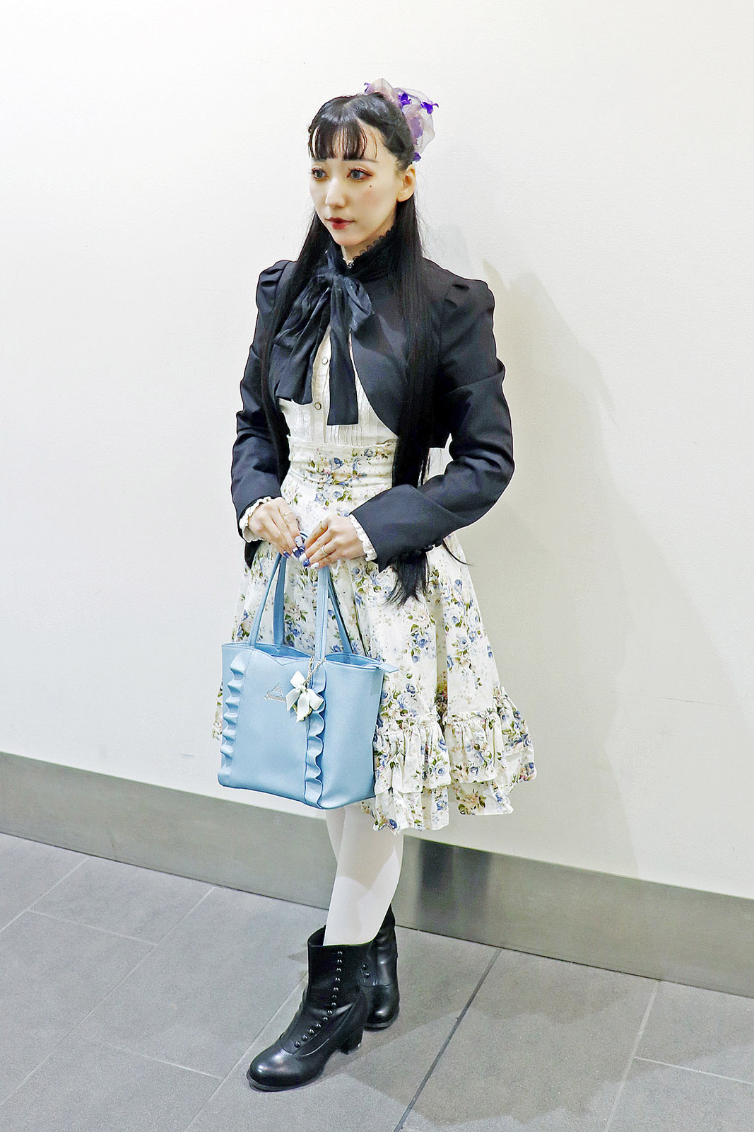 ロココブーケ、特にロココブルーはおそらく春夏を想定されているお洋服だと思うのですが、秋にも着たかったので黒をあわせて落ち着いた雰囲気にしました。